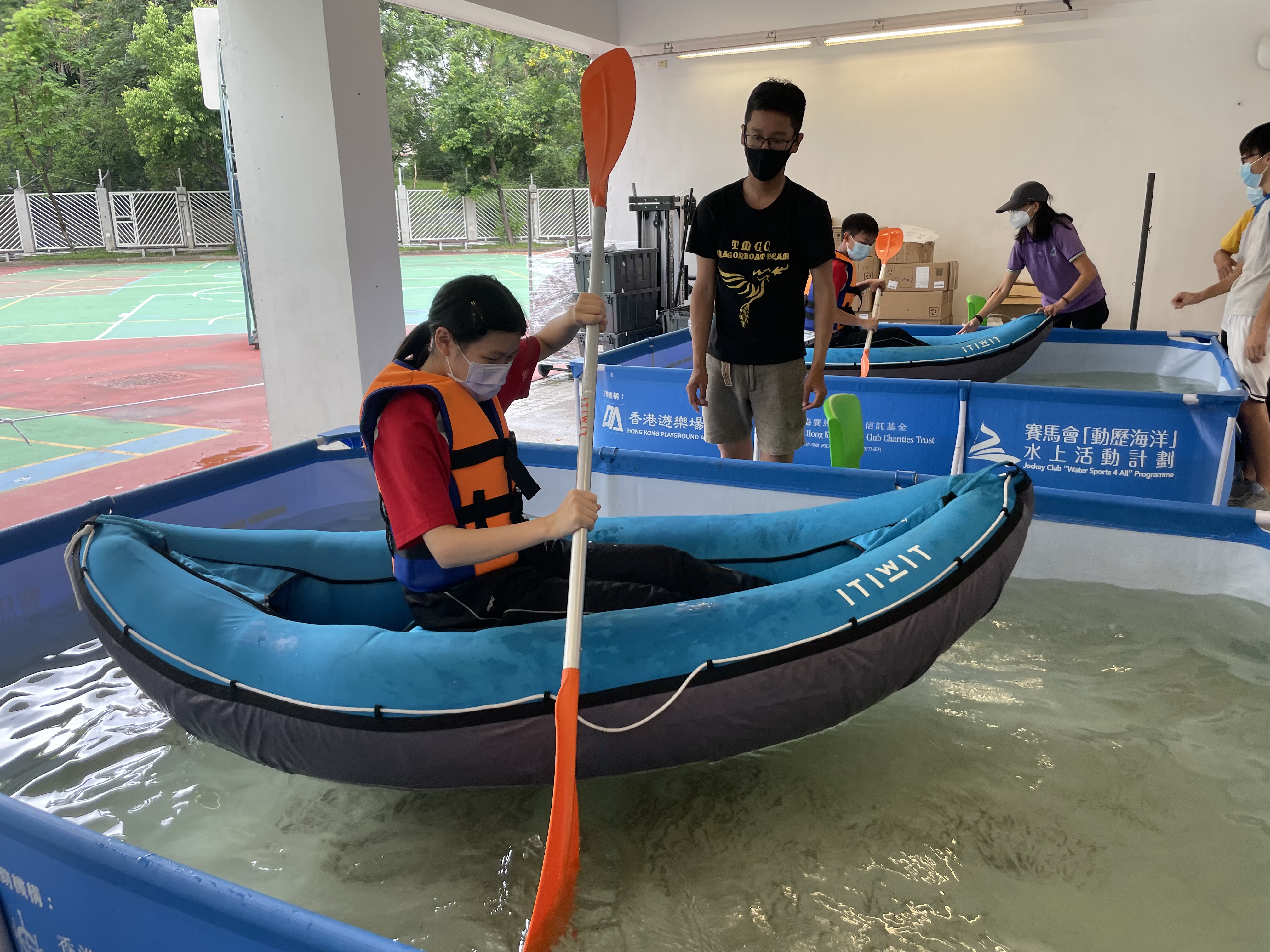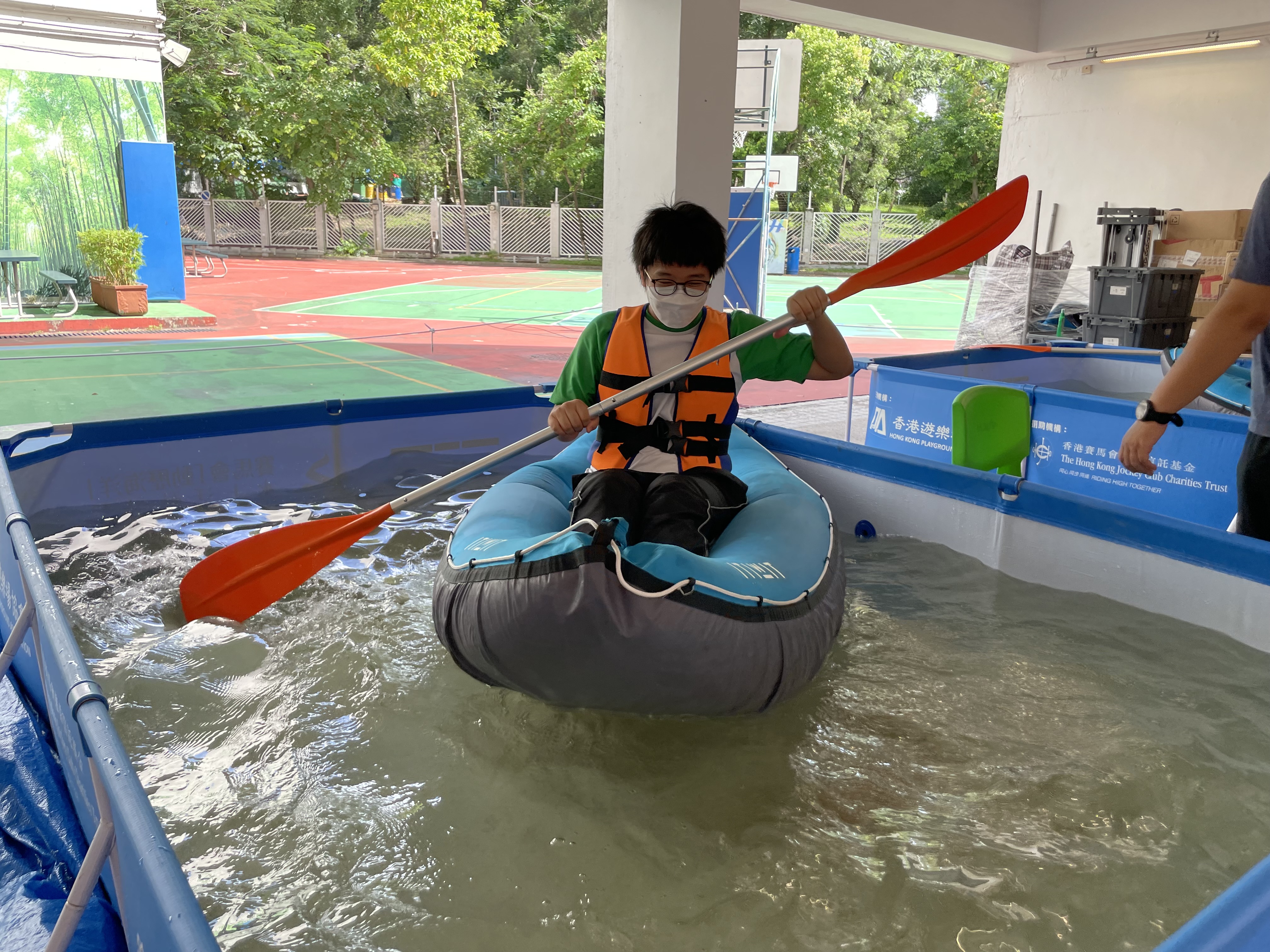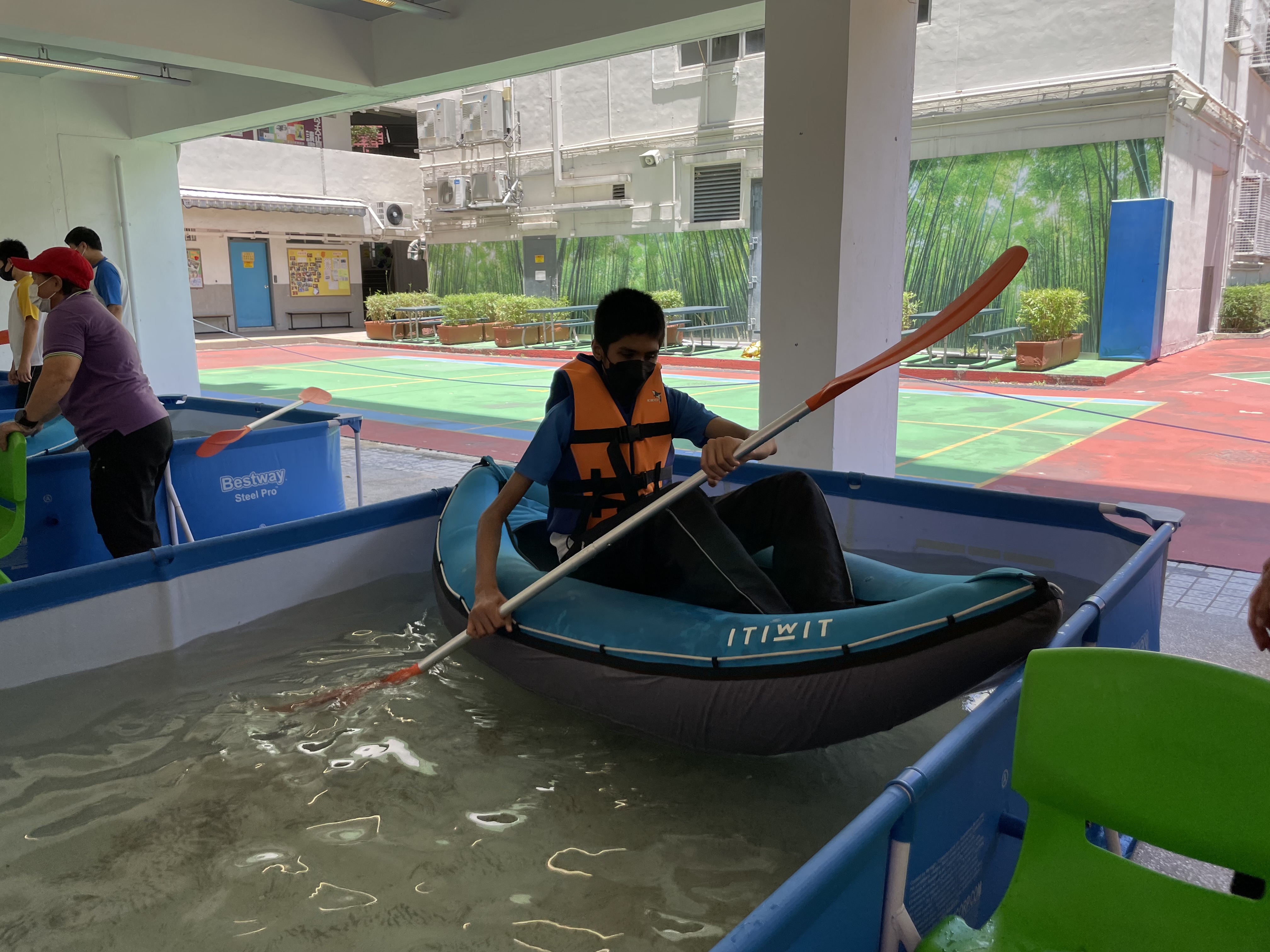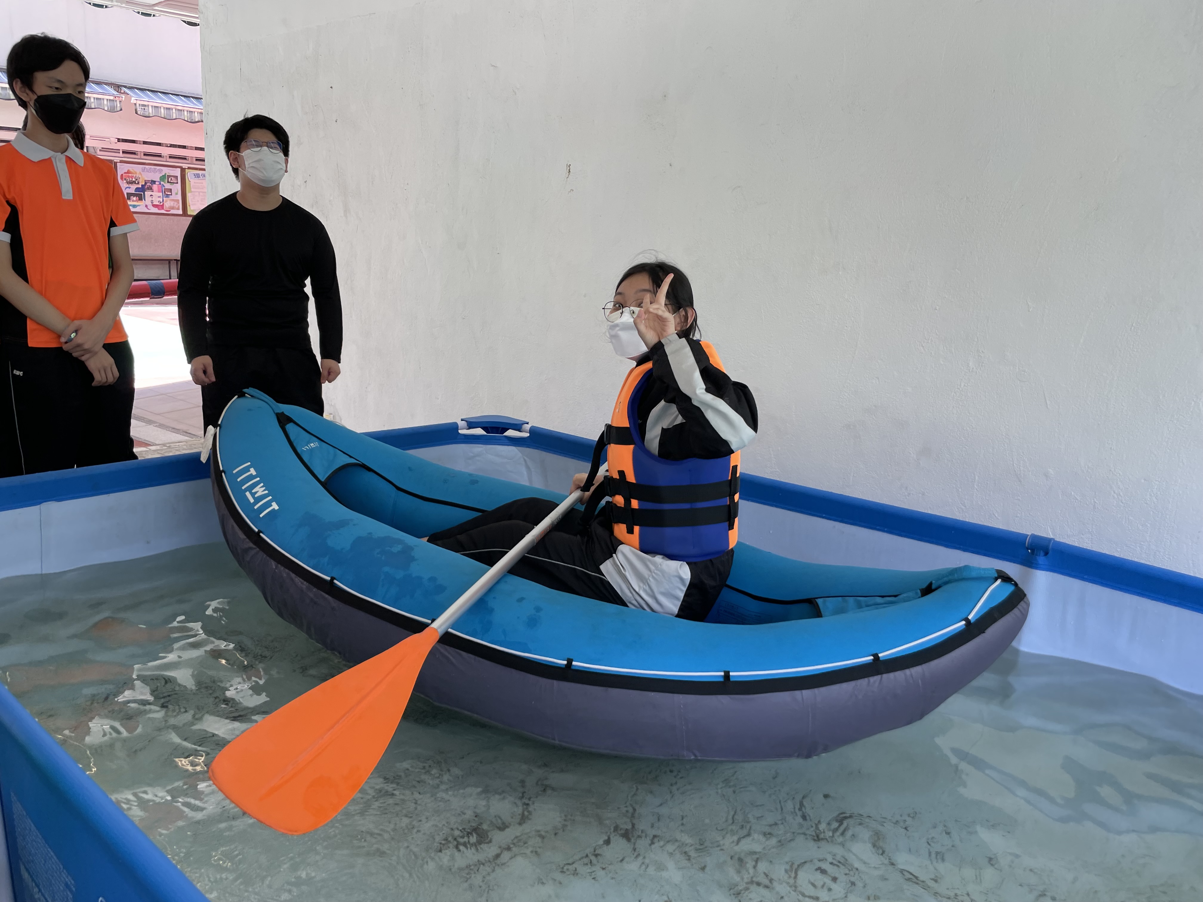 體育科邀請了遊樂場協會到校舉辦親水校園體驗(親水校園)活動,在本校推廣水上活動,同學在體育課堂當中以充氣獨木舟在水池內模擬划漿,並透過獨木舟划機在陸上進行比賽。
