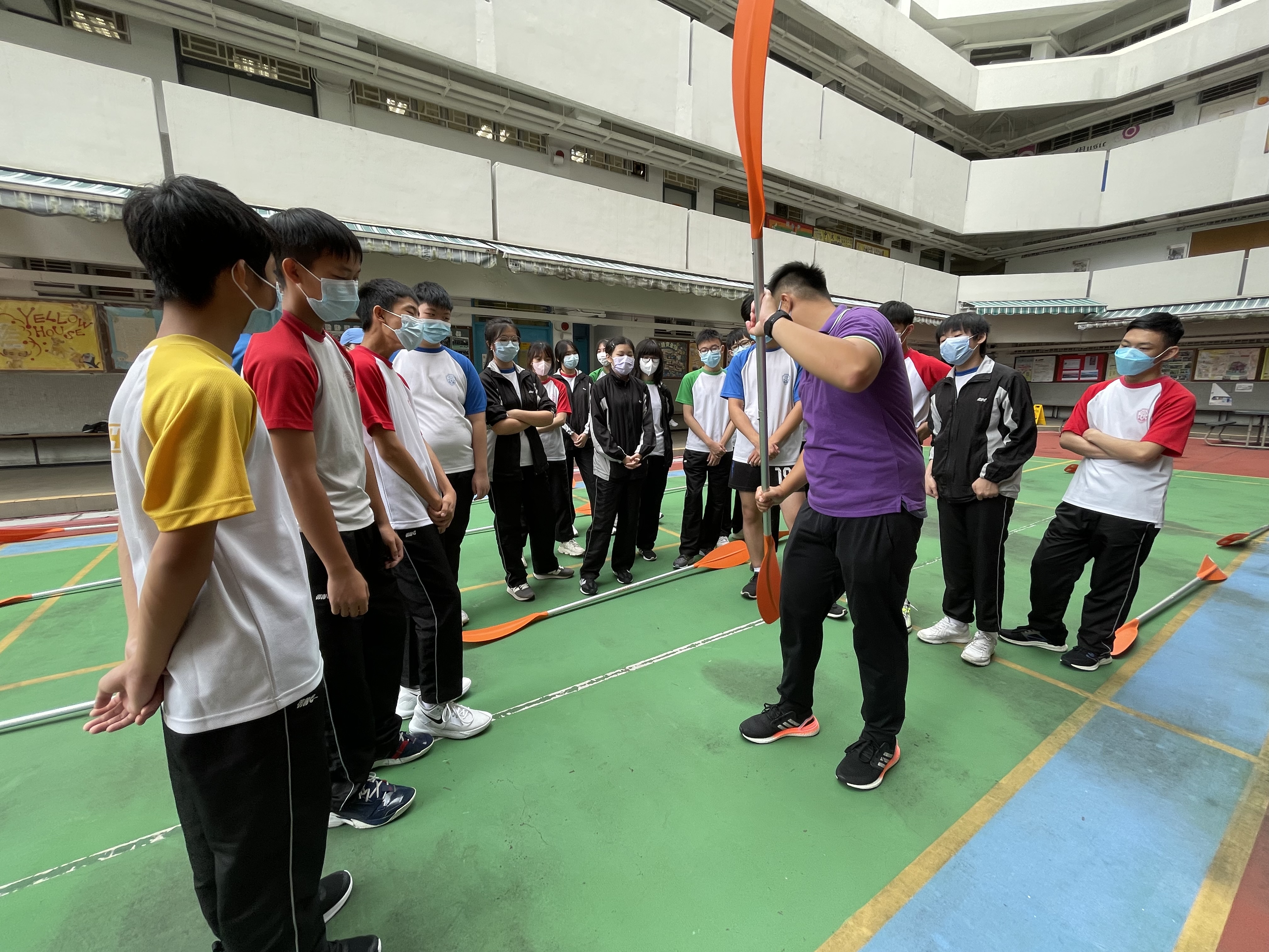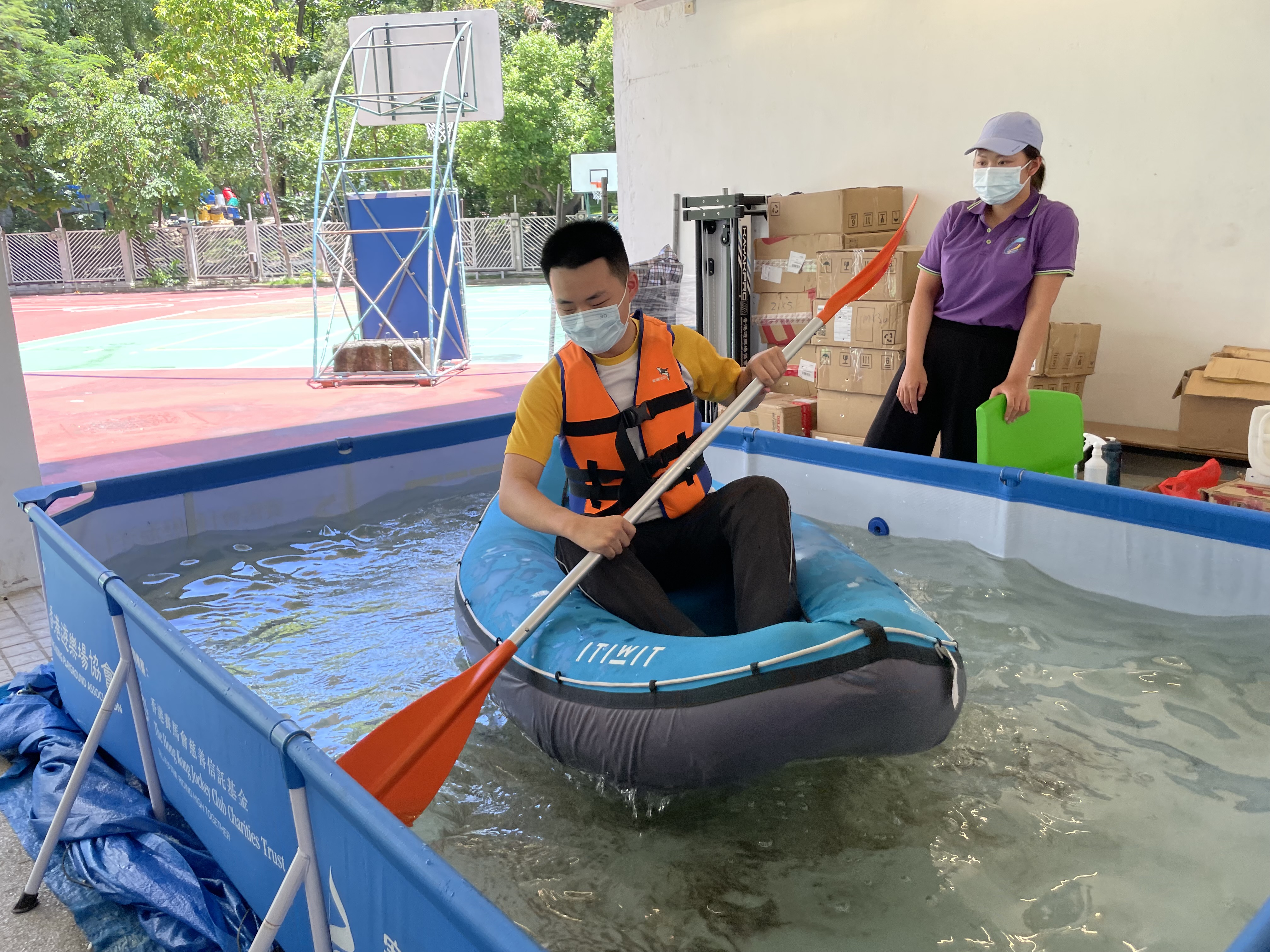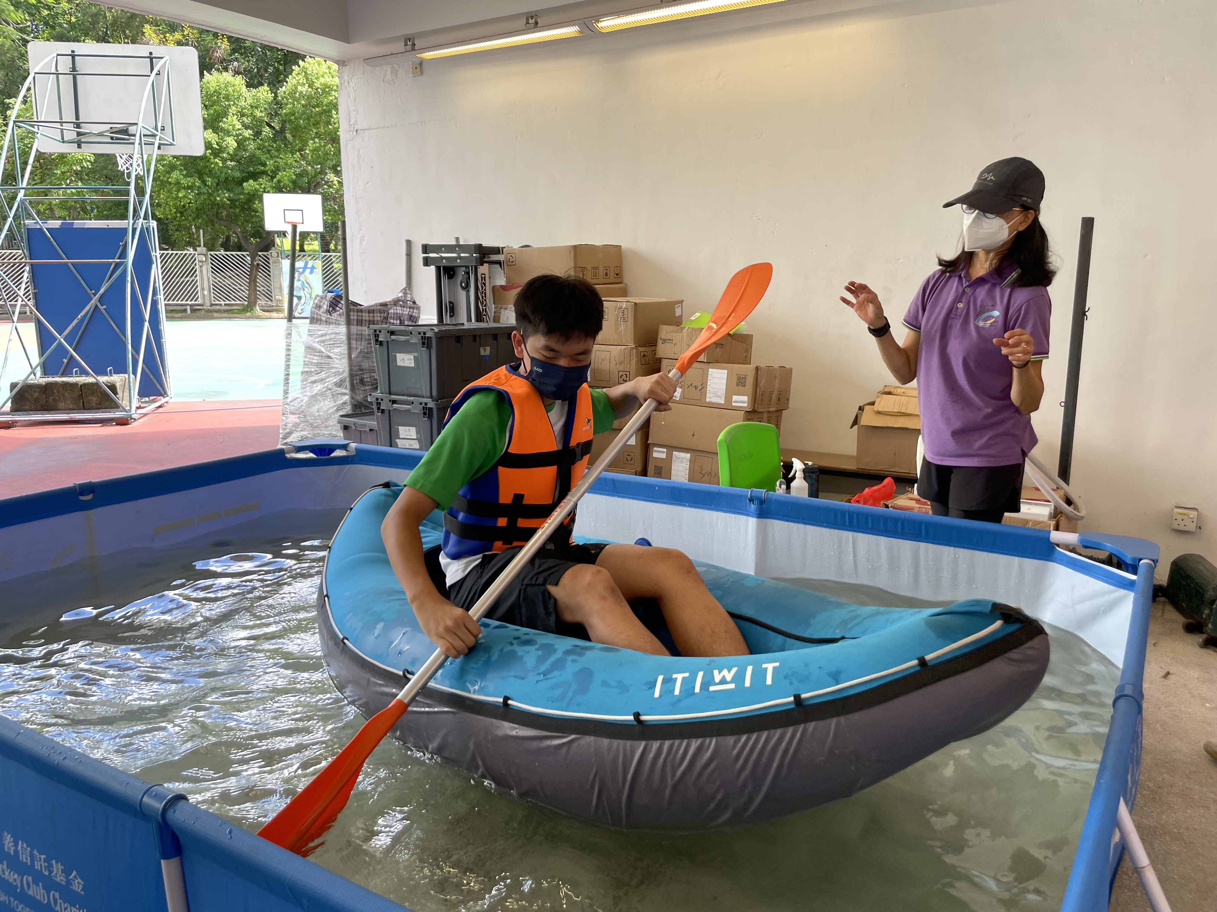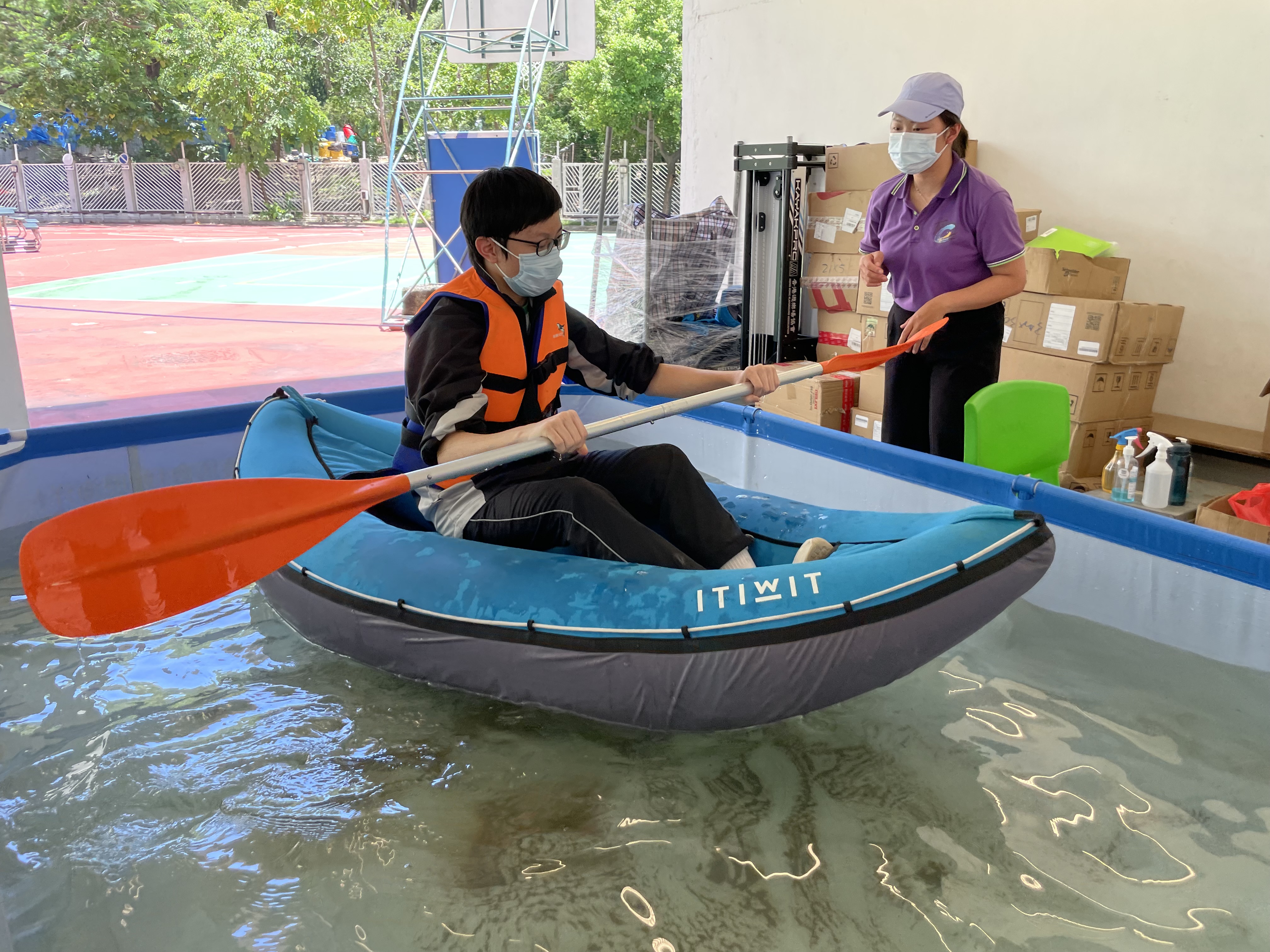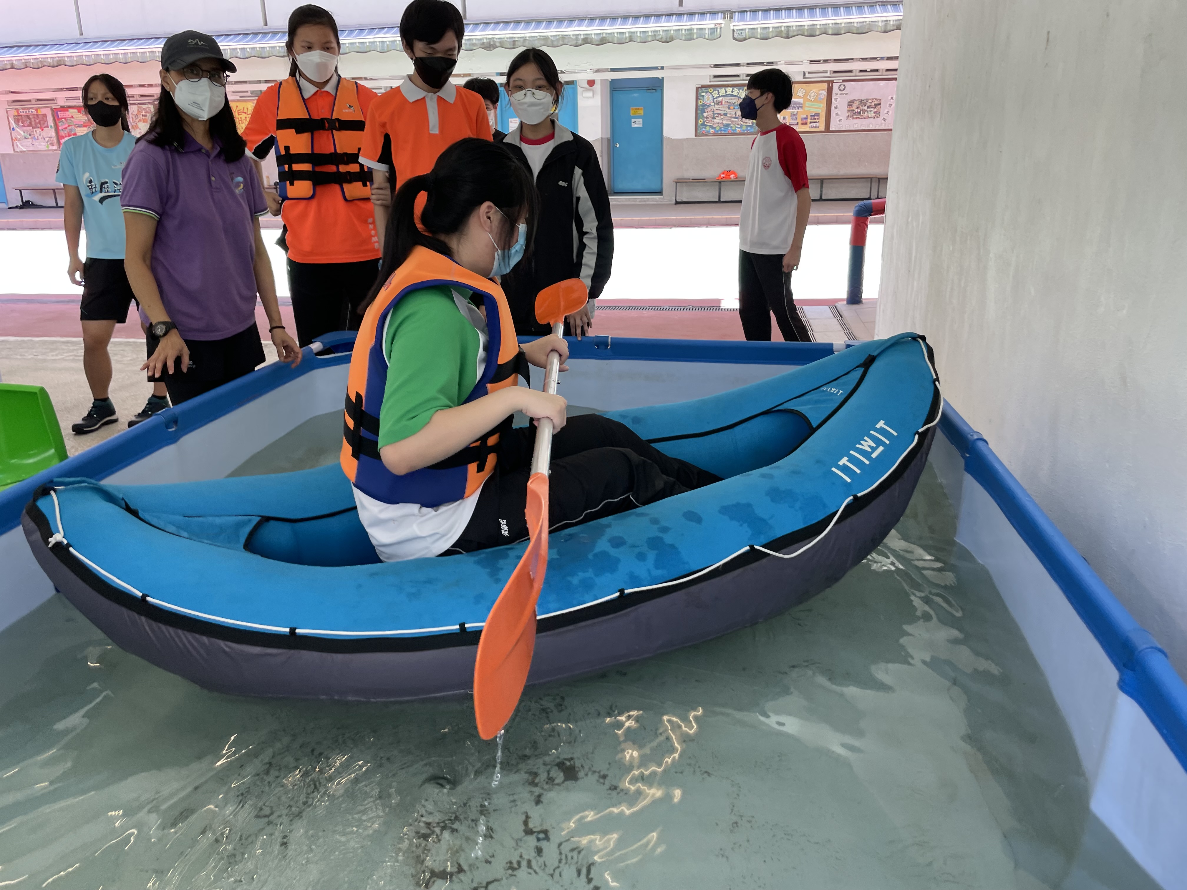 體育科邀請了遊樂場協會到校舉辦親水校園體驗(親水校園)活動,在本校推廣水上活動,同學在體育課堂當中以充氣獨木舟在水池內模擬划漿,並透過獨木舟划機在陸上進行比賽。