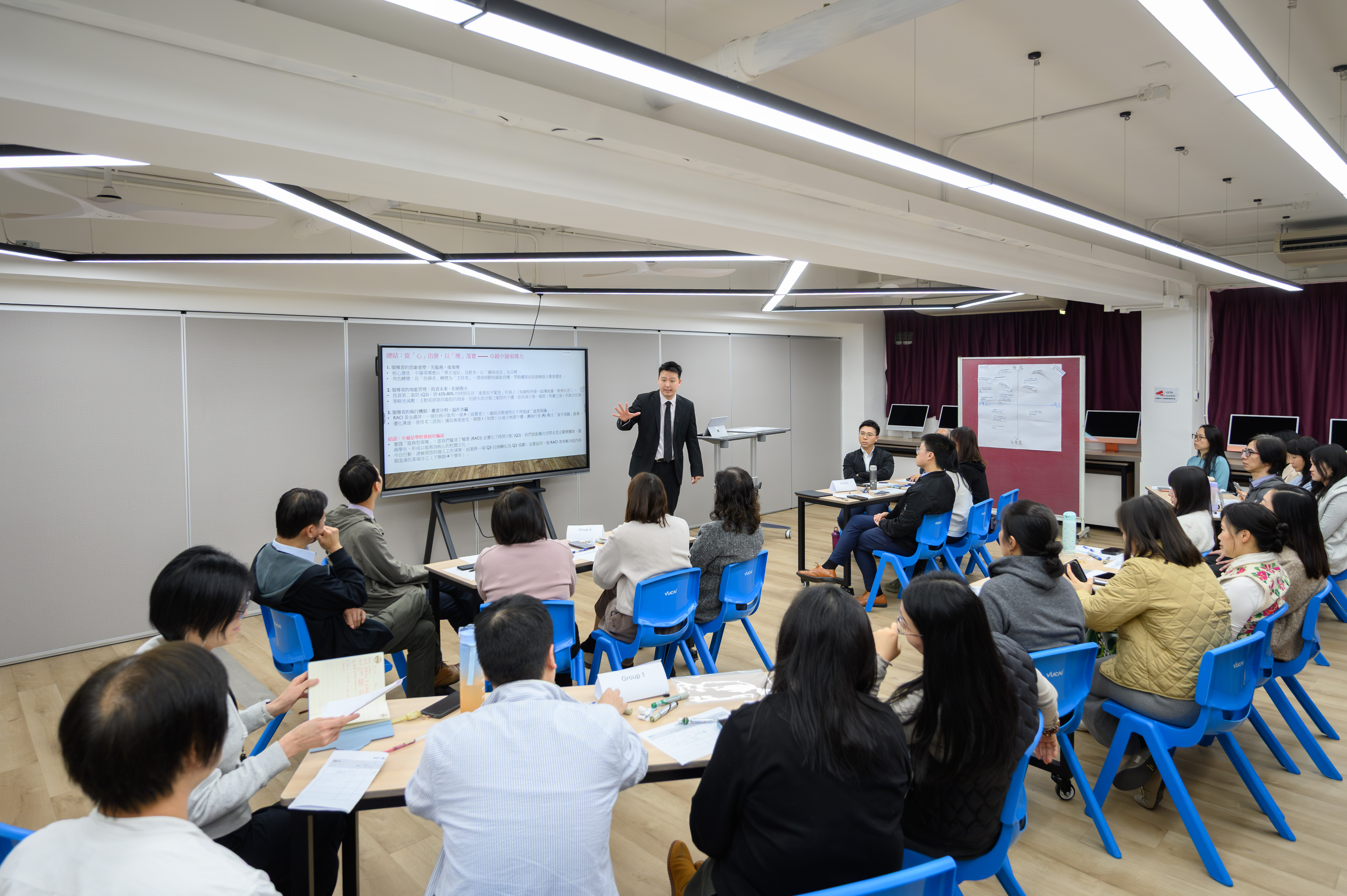 工作坊氣氛輕鬆且具啟發性,老師們積極投入分組報告及經驗分享,現場討論聲音此起彼落。不少參與老師表示,是次培訓提供的工具非常實用,特別是 RACI 模型能直接應用於未來的組別分工中,減少工作上的模糊地帶。